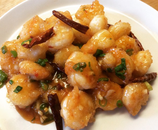 9. Once the sauce thickens, add all the cooked shrimp, dried chiles, and scallions. Toss to coat. Transfer to a plate and serve immediately.