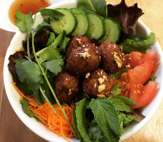 5. To assemble the the noodle salad, place some noodles on the bottom of 4 serving bowls. Place some mixed greens on top and arrange the rest of the vegetables and herbs. Place 4 meatballs in the center and sprinkle the peanuts on top. Serve with the Vietnamese dipping sauce and lime wedge.