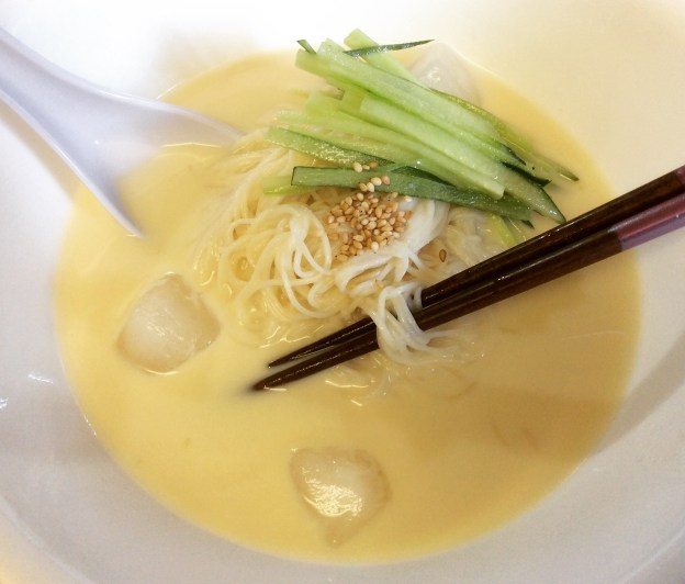 Koreans love cold noodle soups during the summer. One of the most popular Korean cold noodle dishes is naeng myun, which is made with beef broth and buckwheat noodles. Kongguksu, a distant cousin of naeng myun, is made with chilled soy milk and somen noodles. Every summer, when my mom made kongguksu, it always put a smile on my face. I’ve had many versions of kongguksu and have yet to try one better than my mom’s. Most restaurants blend the cooked soybeans but don’t strain it, resulting in a thick, clumpy soup, but my mom adds an extra step and strains the puréed beans in a cheesecloth, yielding a smooth and silky broth. After learning how to prepare kongguksu from my mom, I wrote down the recipe and added it to my repertoire. Note that the recipe requires the soybeans to soak overnight, so please add a day to your prep time.