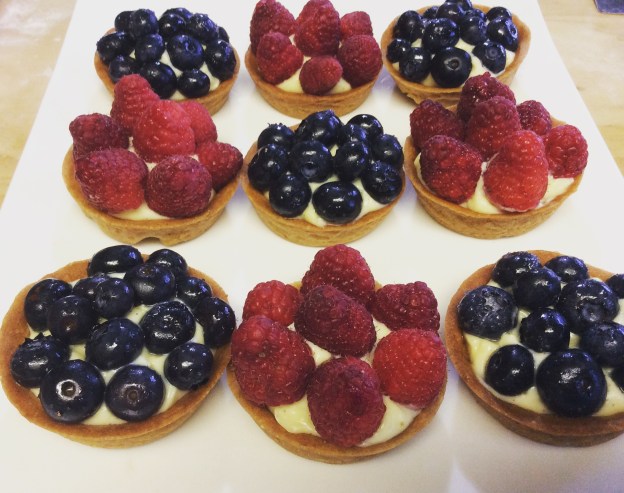 Fruit tarts are delightful summertime treats, with the combination of rich pastry cream, crispy tart shell, and seasonal berries, creating a wonderful taste and texture sensation in your mouth. The crust is crispy with hint of salt, the pastry cream is sweet, smooth and creamy, and the berries add a lovely tart flavor. Because making fruit tarts is such a production, I reserve making them for special occasions. With blue and red berries in season, what better time than the 4th of July to make these lovely treats!