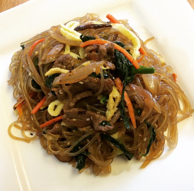 Japchae is a popular Korean beef and vegetable noodle dish, made with dang myun (sweet potato noodles). Commonly served at Korean barbecue restaurants as a side dish, japchae is as colorful as it is tasty, usually being combined with a variety of sautéed vegetables. Because it can be served at room temperature, it is also popular at Korean potlucks and wedding buffets. What makes japchae unique is the translucent and chewy texture of the sweet potato noodles. The noodles are also a great alternative to wheat noodles for people who are gluten intolerant.