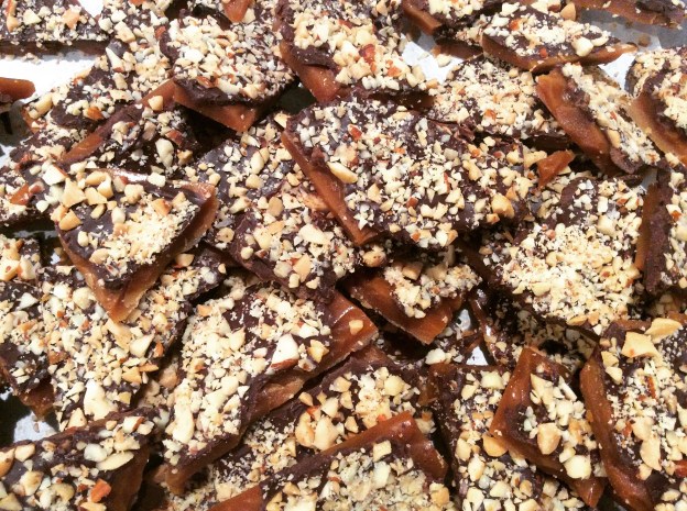 Last year, my husband brought home some delicious toffee. I’m not a huge fan of toffee or candy in general, but this was quite amazing. What I loved about the toffee was the texture – each piece was crunchy but not jaw-breaking, light and not too dense. The toffee also had a nice layer of dark chocolate and some chopped mixed nuts on the top. Overall it was delicious and it inspired me to work on a recipe for it.